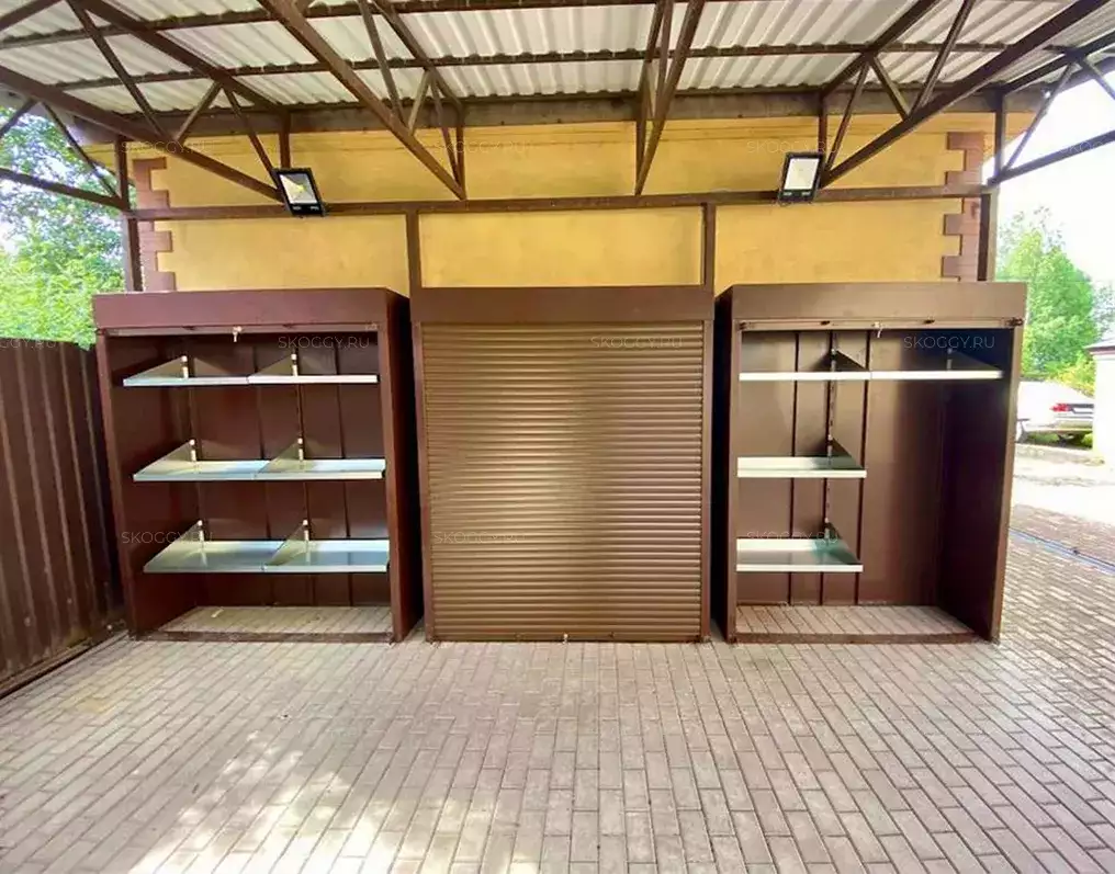 Проект: 3 уличных шкафа по индивидуальным размерам для хранения хозяйственных принадлежностей в шоколадно-коричневом цвете.