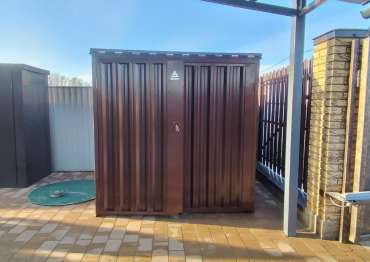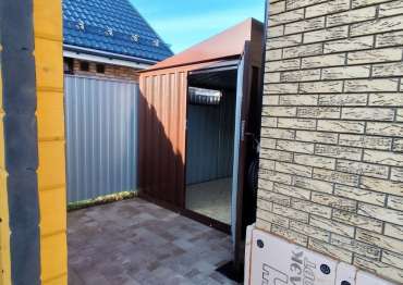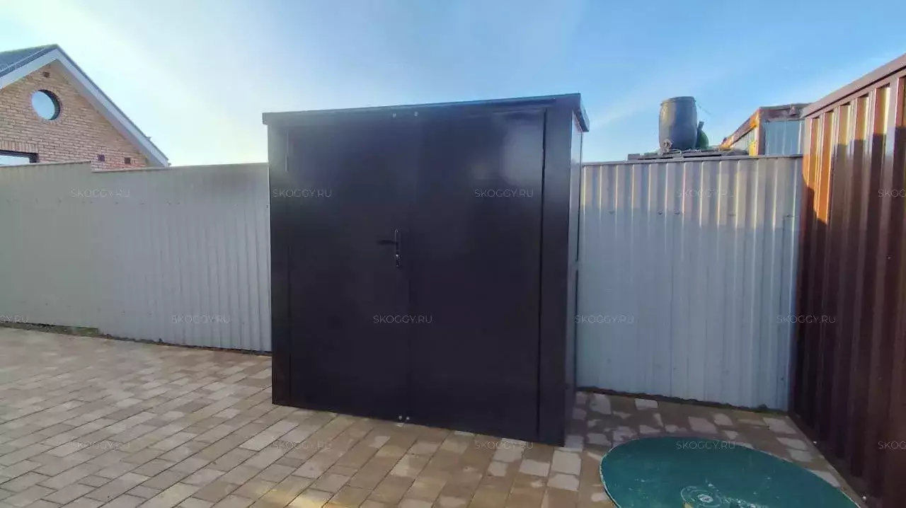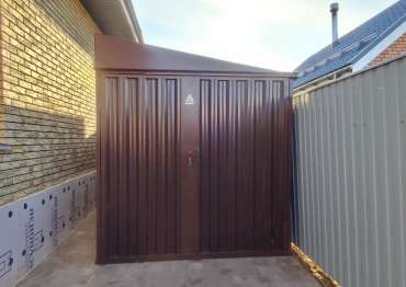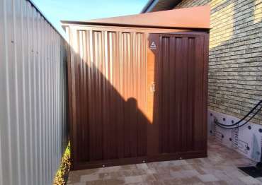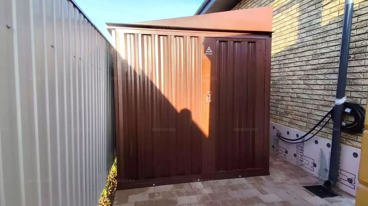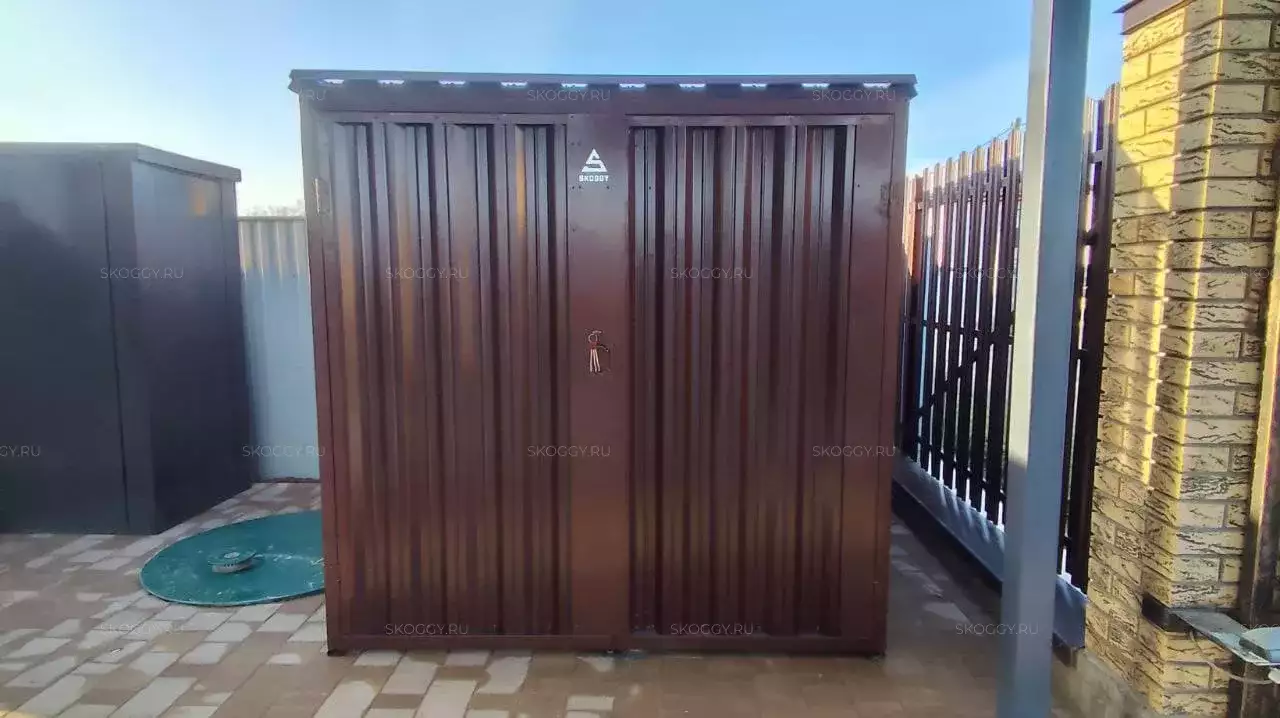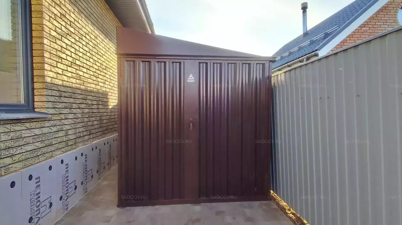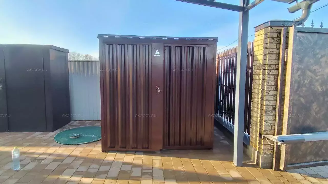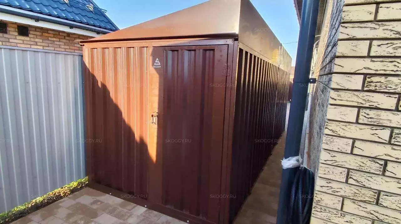 Проект: уличный шкаф 2,03 х 2,022 х 0,88 м + 6-метровый хозблок для хранения мототехники, садовой техники и инвентаря в шоколадно-коричневом цвете.