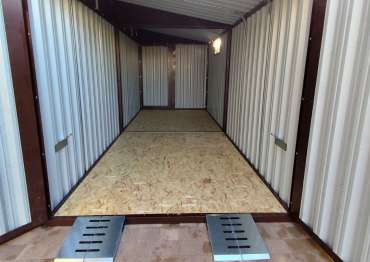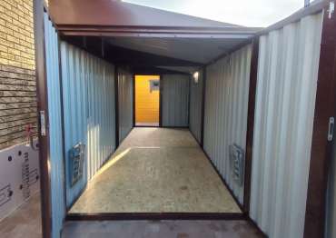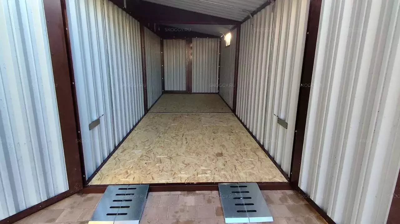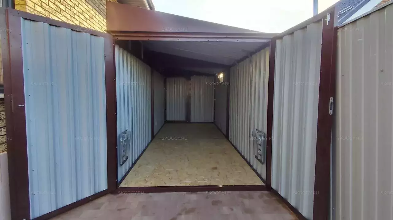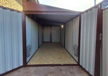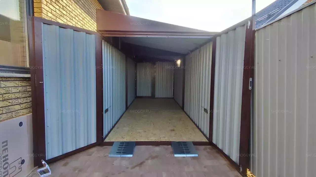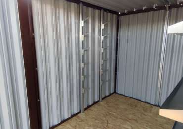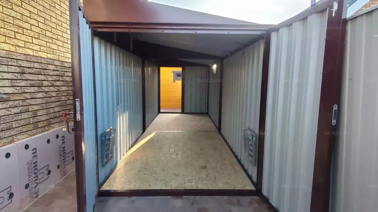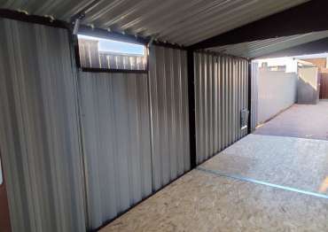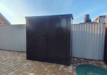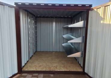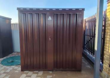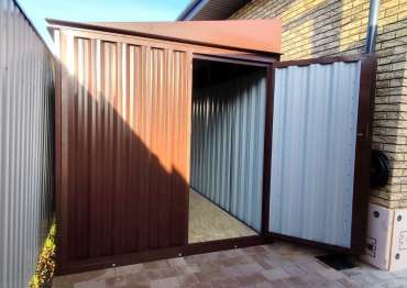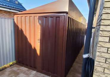 Нами были изготовлены конструкция уличного шкафа размером 2,03 х 2,022 х 0,88 м в популярнейшем шоколадно-коричневом цвете RAL 8017 и стандартная 6-метровая конструкция с односкатной крышей и торцевой воротной группой в аналогичном шоколадном цвете.