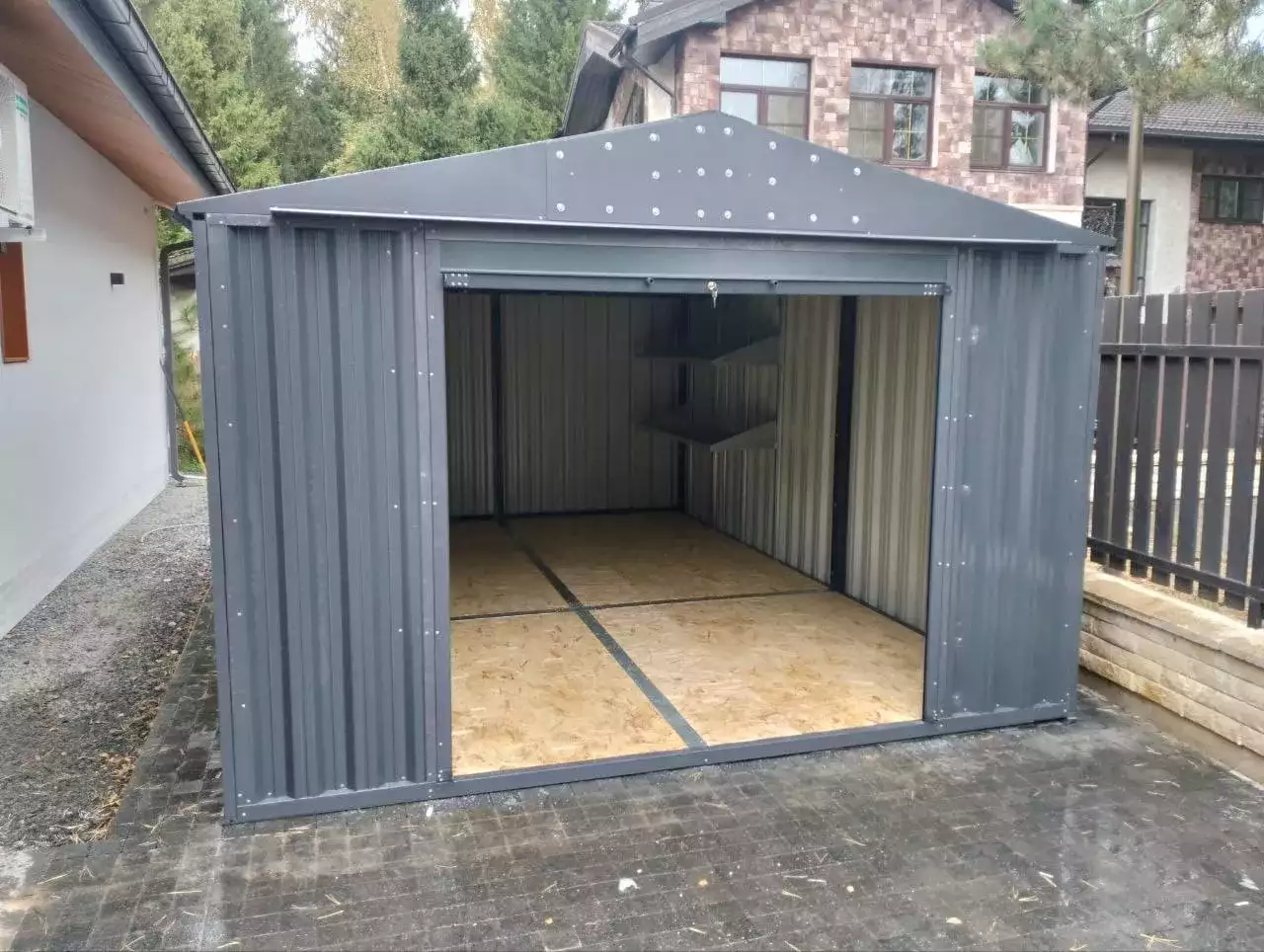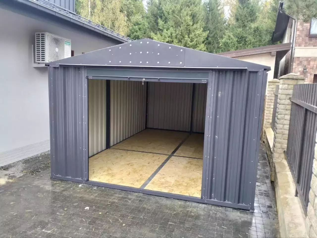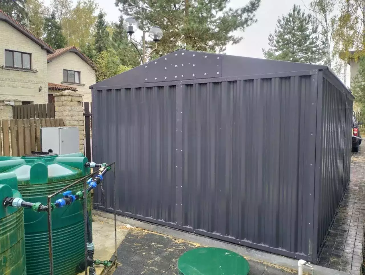 Проект: хозблок 5 х 3,5 м для хранения садовой техники в графитовом цвете.