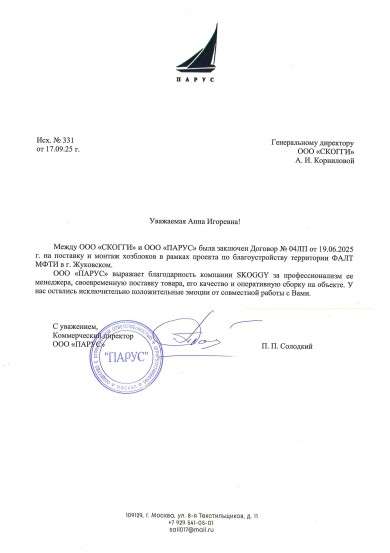 Между ООО «СКОГГИ» и ООО «ПАРУС» была заключен Договор № 04ЛП от 19.06.2025 г. на поставку и монтаж хозблоков в рамках проекта по благоустройству территории ФАЛТ МФТИ в г. Жуковском. ООО «ПАРУС» выражает благодарность компании SKOGGY за профессионализм ее менеджера, своевременную поставку товара, его качество и оперативную сборку на объекте. У нас остались исключительно положительные эмоции от совместной работы с Вами.