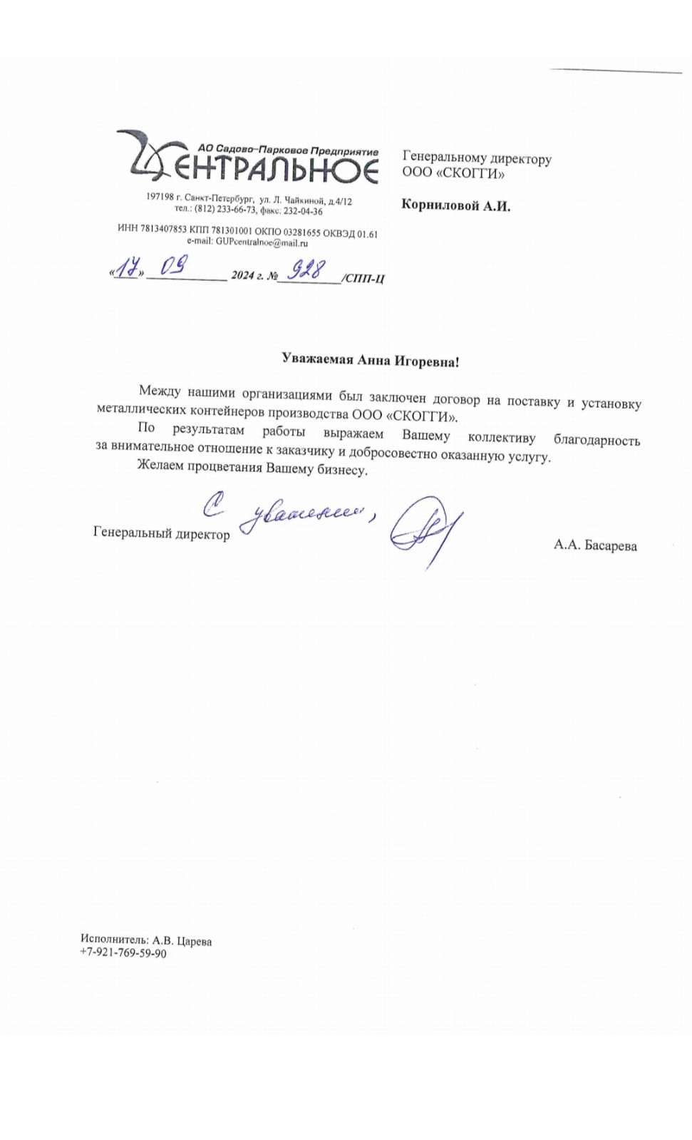 С уважением, генеральный директор АО Садово-Парковое Предприятие «Центральное» А. А. Басарева