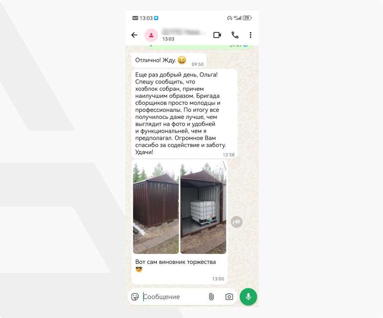 Еще раз добрый день, Ольга! Спешу сообщить, что хозблок собран, причем наилучшим образом. Бригада сборщиков просто молодцы и профессионалы. По итогу все получилось даже лучше, чем выглядит на фото и удобней и функциональней, чем я предполагал. Огромное Вам спасибо за содействие и заботу. Удачи!