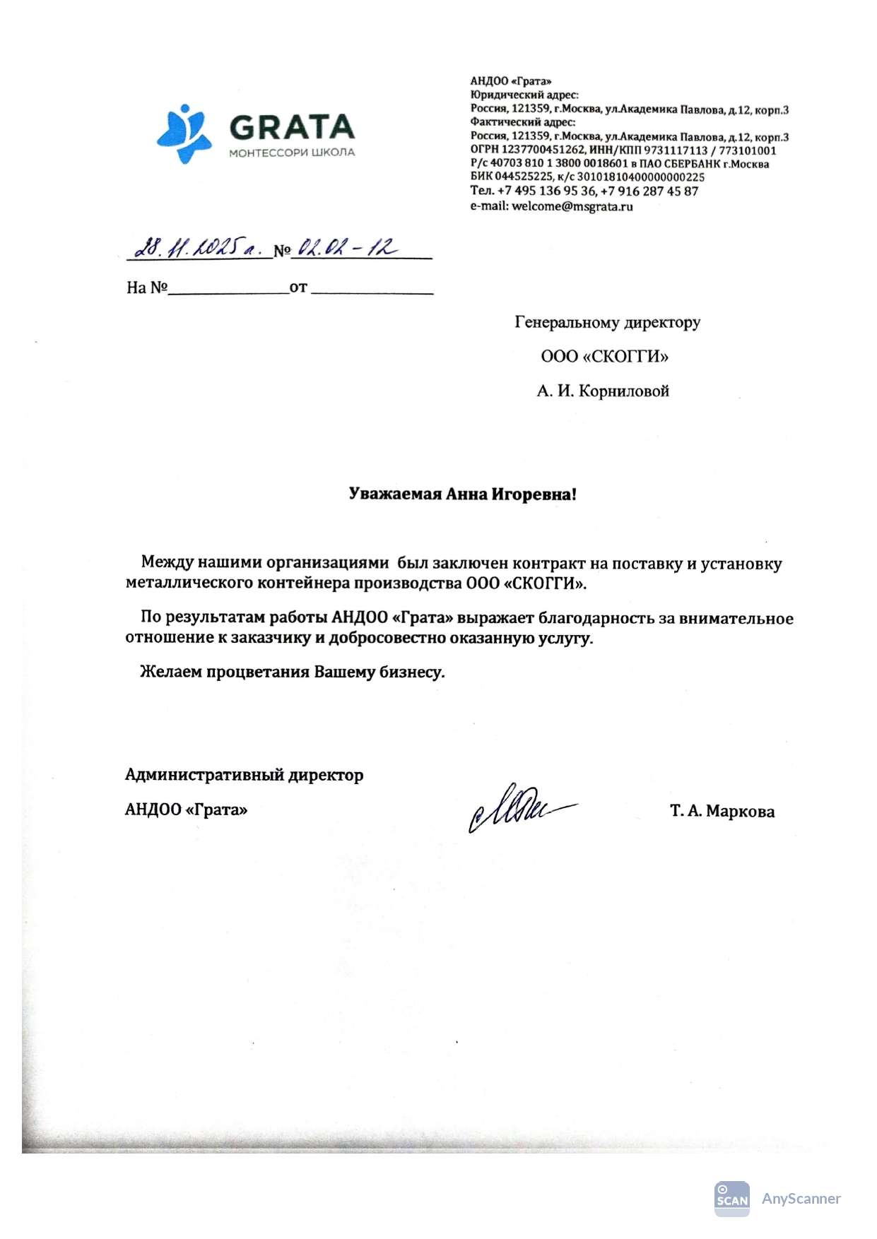 По результатам работы АНДОО «Грата» выражает благодарность за внимательное отношение к заказчику и добросовестно оказанную услугу.