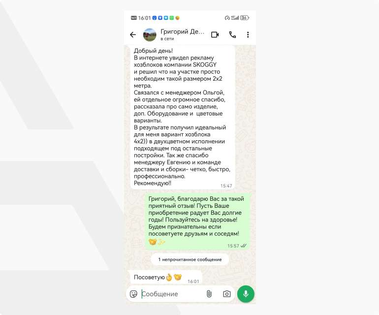Хочу выразить огромную благодарность вашей компании за красиво выполненную работу и качественный сервис. Менеджер Алексей оперативно и грамотно решал все вопросы, начиная с оформления договора и оплаты, вплоть до организации взаимодействия по доставке и монтажу металлического сарая. Все было сделано точно в согласованный срок, четко и организованно! Когда я приехал посмотреть за разгрузкой, красивый как на картинке сарай стоял уже собранный. Еще раз огромное спасибо Алексею и всем сотрудникам компании Skoggy, которые принимали участие в выполнении моего заказа!