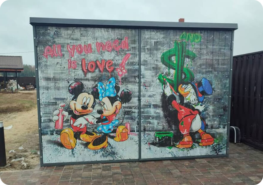 Изготавливаем в цинке, различных цветах RAL. Возможно частичное или полное брендирование посредством нанесения печати. Если у вас есть любимая картинка или рисунок - мы можем его напечатать на контейнере.