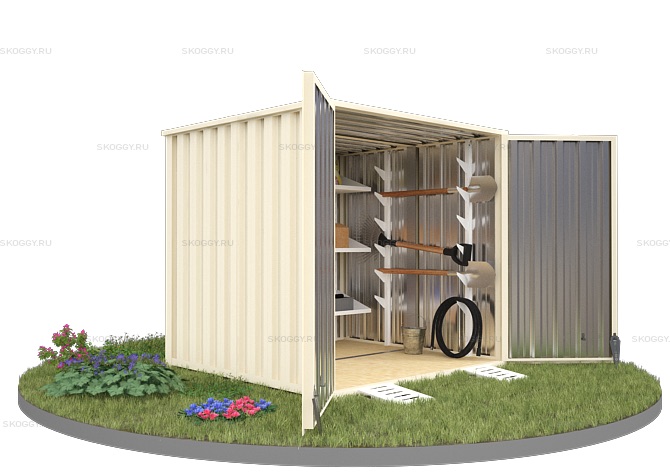 Конструкция выполнена из металла толщиной 0,65 мм. Для каркаса прикрепляются профлисты с помощью болтов и саморезов. Устанавливается дверь и ворота. При необходимости компания SKOGGY может предложить дополнительное оборудование, такое как: пандусы, стеллажи для хранения инструментов, специальную систему для хранения шин и многое другое.
