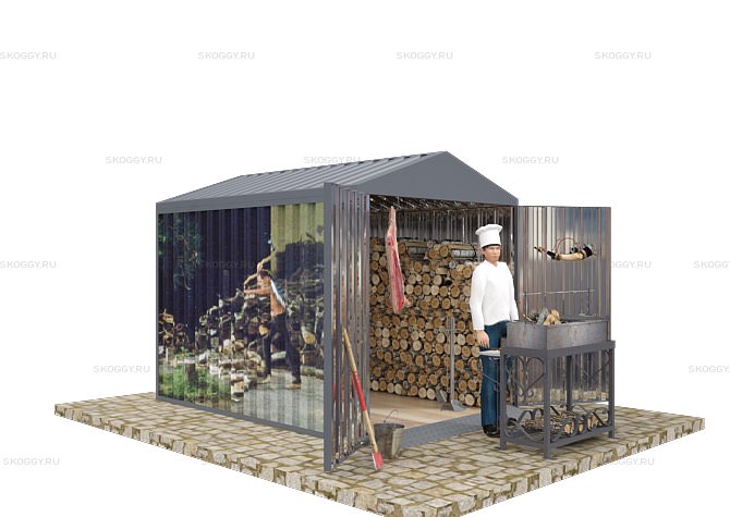 Прочный и надежный металлический сборно-разборный контейнер в качестве дровницы. Это полноценный хозблок, в котором можно хранить дрова и различные принадлежности для летнего отдыха: мангал, гриль-барбекю и т.д.