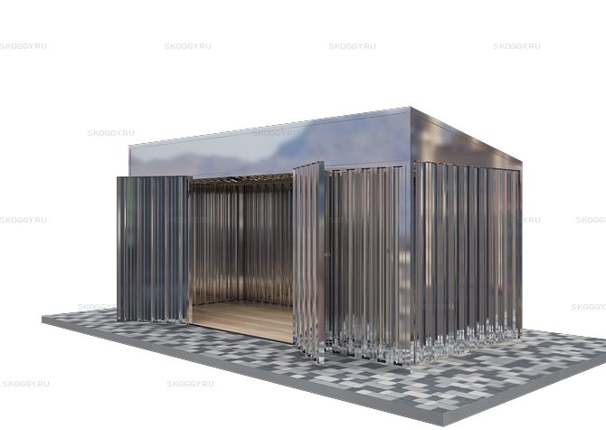 По своей конструкции контейнер Skoggy представляет модульное сооружение, которое состоит из сборных элементов. При сборке элементы устанавливаются один в другой и фиксируются болтовыми соединениями. Конструкция дверей, крыши и стен представляют собой каркас из сложногнутого профиля толщиной 0,7 мм. Каркас обшивается профлистом НС-35 толщиной 0,45-0,55 мм. Такая толщина оптимальна для обеспечения прочности и устойчивости конструкции.